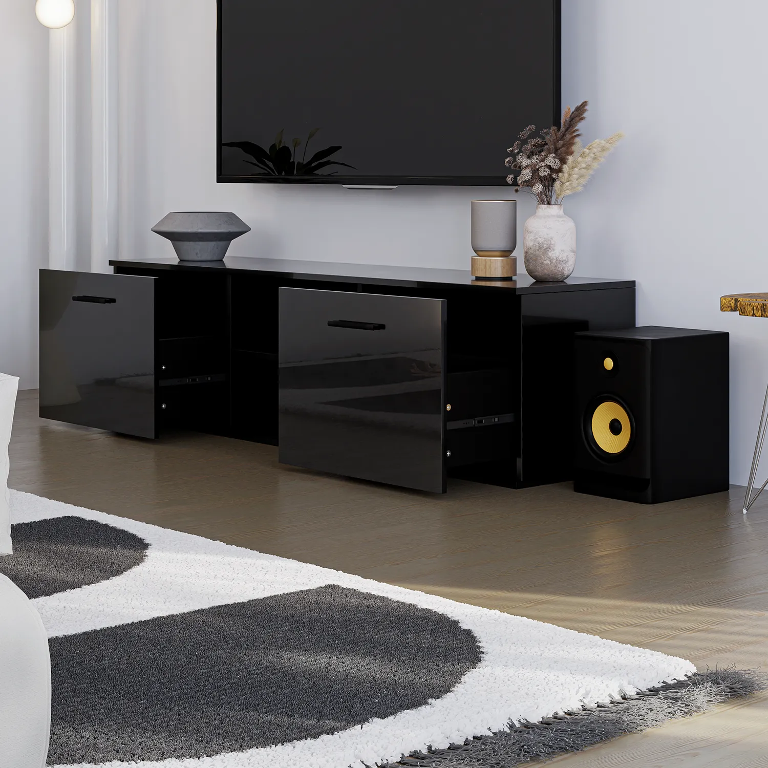 Modernisez votre salon avec le meuble télé LUMEN. Doté d’un design épuré et d’une finition lustrée disponible en blanc ou en noir, il offre des espaces de rangement fermés et des étagères ouvertes pour organiser vos appareils électroniques et accessoires. Élégant et pratique, il sublime votre espace de vie.