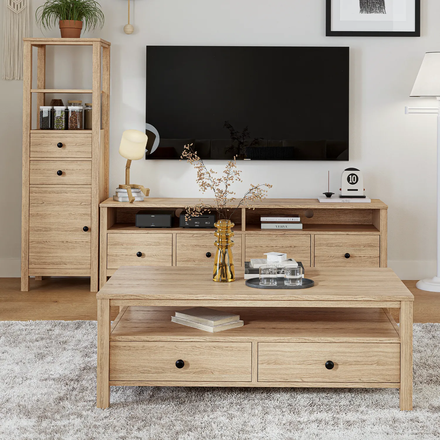 Collection MĀRLO : meuble TV, table basse et bibliothèque style scandinave en chêne clair. Design minimaliste, lignes épurées et finitions soignées. Nombreux rangements : tiroirs, niches et passe-câbles. Idéale pour un salon chaleureux et moderne, robuste et pratique, pensée pour optimiser l’espace. Pour TV 75", plateau spacieux.