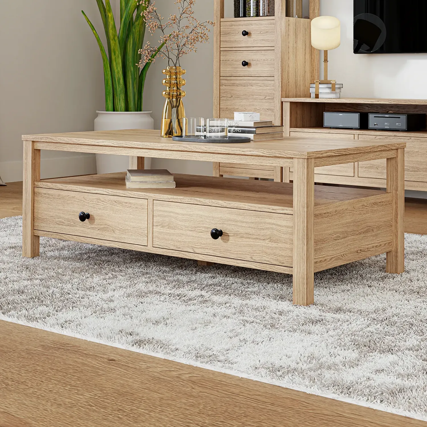 Avec son design chaleureux en laminé de bois fruitier, la table basse MĀRLO allie élégance et fonctionnalité. Elle offre deux tiroirs pratiques et une tablette ouverte pour vos essentiels du salon. Parfaite pour compléter un décor moderne et harmoniser avec le meuble télé MĀRLO.