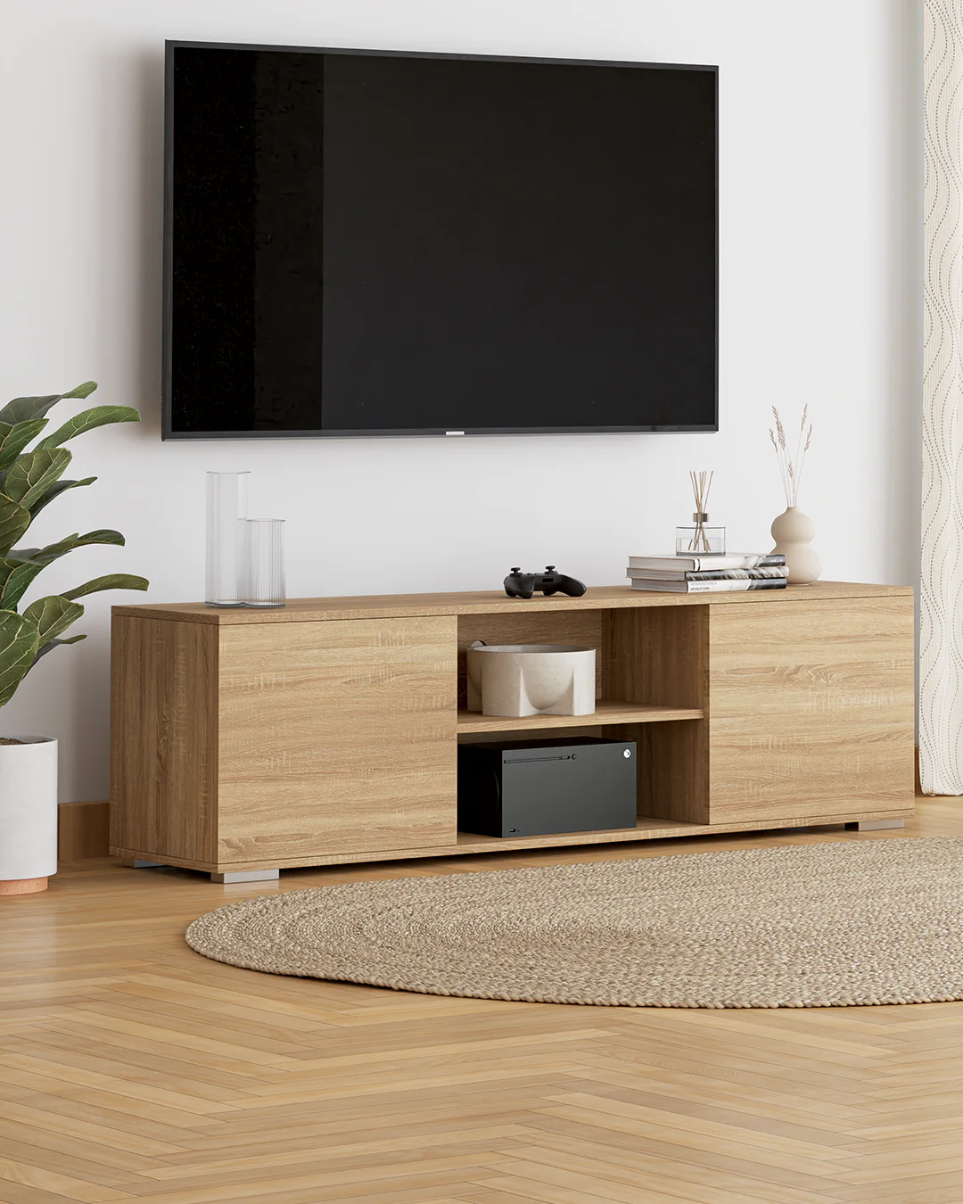 Le meuble de télé STAN associe la chaleur du bois à une conception élégante. Sa silhouette imposante abrite deux espaces de rangement visibles, flanqués de part et d'autre par des armoires dissimulant astucieusement des espaces de stockage supplémentaires. Un équilibre parfait entre fonctionnalité et esthétique.
